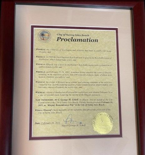 ABŞ-ın Florida ştatının daha bir şəhəri, Sanni Ayls Biç (Sunny İsles Beach) Xocalı soyqırımının 29-cu ildönümü ilə əlaqədar “proklamasiya” – bəyannamə yayıb.