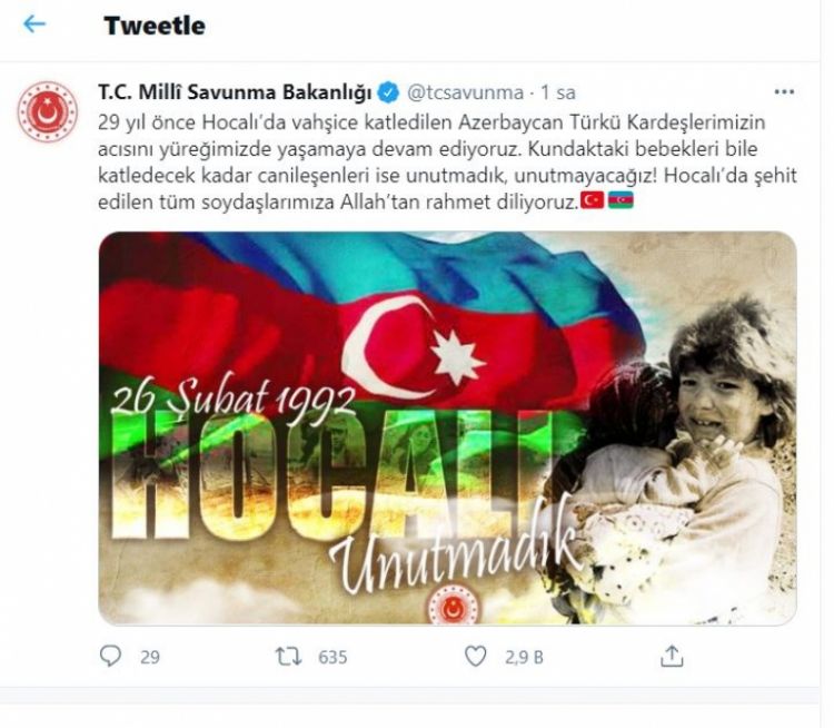 Paylaşımda, həmçinin deyilir: “Körpə uşaqları belə qətlə yetirən caniləri isə unutmadıq, unutmayacağıq! Xocalıda şəhid olan bütün soydaşlarımıza Allahdan rəhmət diləyirik”.