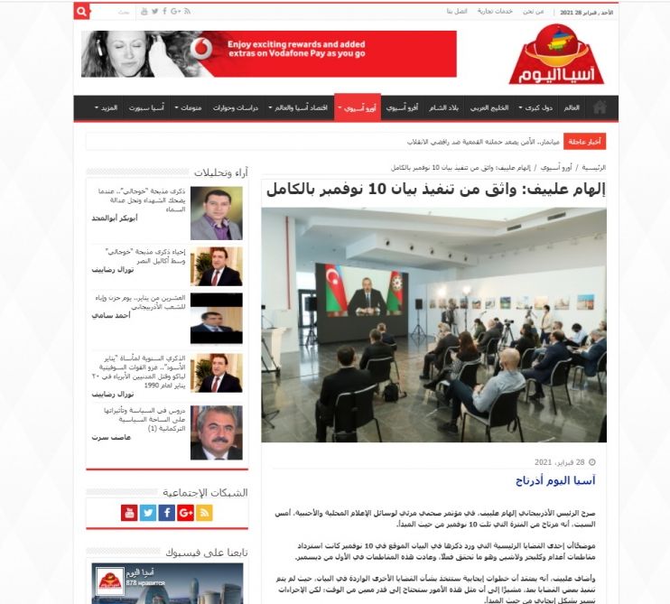 NUHÇIXAN İnformasiya Agentliyi xəbər verir ki, Misirin “Asiaelyoum” informasiya agentliyi və “Aldiplomasy” portalı dörd saatdan çox davam etmiş mətbuat konfransında Prezident İlham Əliyevin jurnalistlərin suallarını ətraflı şəkildə cavablandırdığını, vacib məsələlərə toxunduğunu, bir sıra önəmli mesajlar verdiyini qeyd edib. “İlham Əliyev: 10 noyabr Bəyanatı prinsip etibarilə icra edilir” sərlövhəli materiallarda Azərbaycanın dövlət başçısının bölgədə yaranmış son vəziyyət, Ermənistanda siyasi böhran, hərbi əsirlərin qaytarılması və digər məsələlər haqqında 35 media qurumunun 50-dən çox sualını cavablandırdığı vurğulanıb.