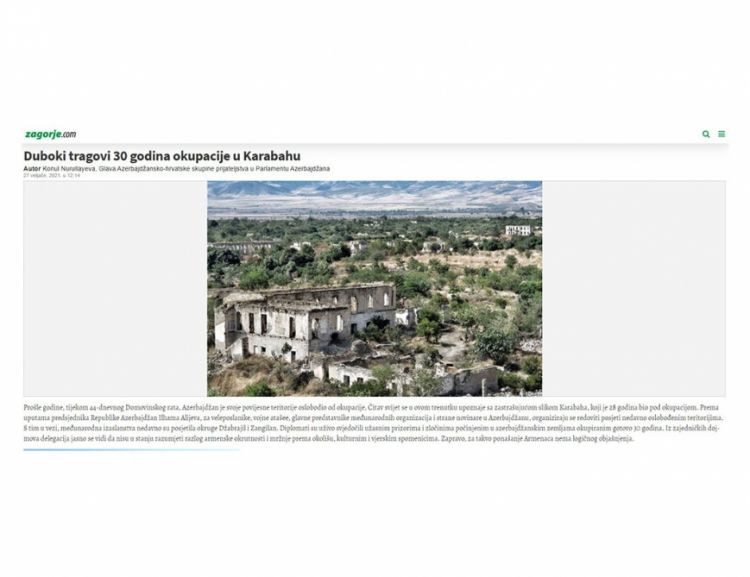 Xorvatiyanın “Zagorje” portalında Milli Məclisin deputatı, Azərbaycan-Xorvatiya parlamentlərarası işçi qrupunun rəhbəri Könül Nurullayevanın “Qarabağda 30 illik işğalın dərin izləri” adlı məqaləsi dərc olunub.