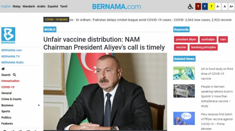 NUHÇIXAN İnformasiya Agentliyi xəbər verir ki, Malayziyanın BERNAMA Milli Xəbər Agentliyi martın 4-də bu barədə geniş məqalə dərc edib. “Peyvəndin ədalətsiz bölgüsü: Qoşulmama Hərəkatının sədri, Prezident Əliyev vaxtında çağırış edir” sərlövhəli məqalədə dövlətimizin başçısının fevralın 1-də Azərbaycan Televiziyasına verdiyi müsahibədə COVID-19 peyvəndi barədə söylədiyi tənqidi fikirlərə geniş yer verilib. Qeyd olunub ki, Prezident İlham Əliyev hər zaman olduğu kimi, bu dəfə də beynəlxalq müraciətlərindəki cəsarəti bir daha nümayiş etdirərək, COVID-19 peyvəndinin ölkələr arasında ədalətsiz və qeyri-bərabər bölgüsünü gündəmə gətirməklə Qoşulmama Hərəkatı təşkilatına üzv dövlətlərin maraqlarını ifadə edib.