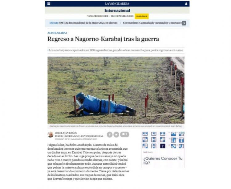 Azərbaycan Prezidenti İlham Əliyevin fevralın 26-da yerli və xarici media nümayəndələri üçün keçirdiyi mətbuat konfransında iştirak edən jurnalistlər ölkəmizlə bağlı həqiqətləri işıqlandırmaqda davam edirlər. Həmin jurnalistlər işğaldan azad olunmuş rayonlarımıza da səfər edib, erməni vəhşiliyini gözləri ilə görüb və bu barədə dünya ictimaiyyətini ətraflı məlumatlandırırlar. Növbəti belə məqalə İspaniyanın nüfuzlu “La Vanguardia” qəzetində dərc olunub.