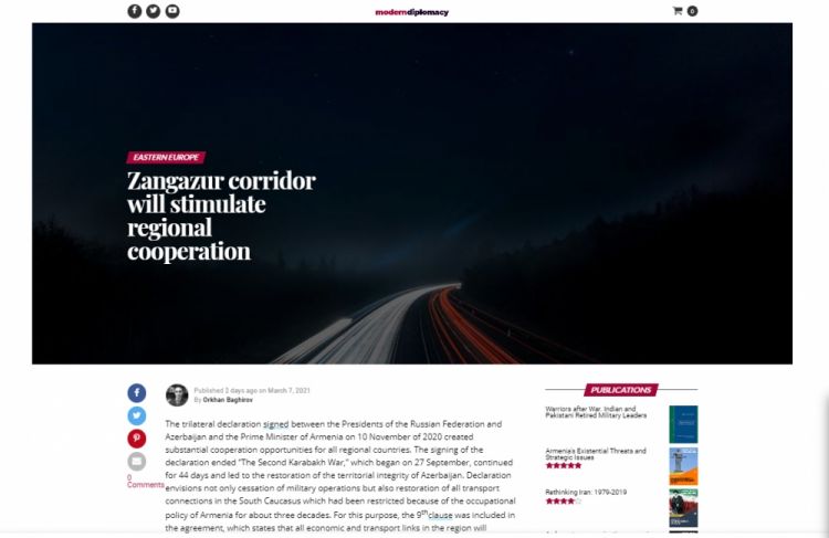 “Modern Diplomacy” portalında “Zəngəzur dəhlizi regional əməkdaşlığı stimullaşdıracaq” adlı məqalə dərc olunub