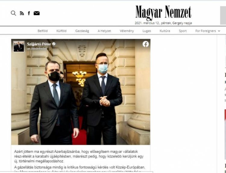 Macarıstanın geniş oxucu auditoriyasına malik olan “Madyar Nemzet” qəzetinin onlayn versiyasının saytında bu ölkənin xarici işlər və ticarət naziri Peter Siyartonun Azərbaycana səfəri barədə məlumat dərc edilib.