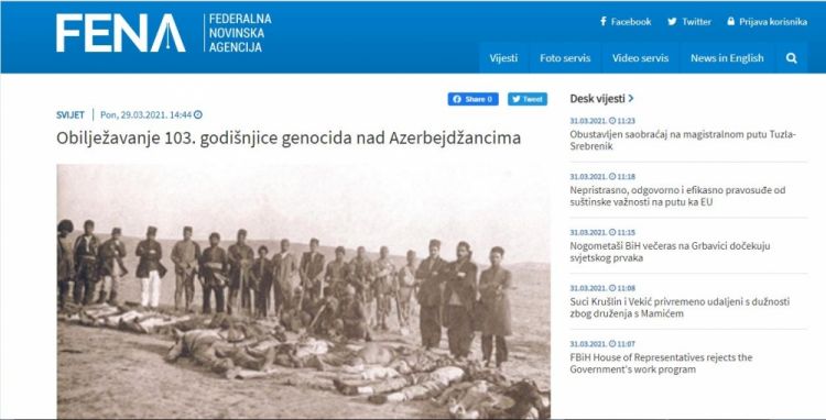 Bosniyanın FENA informasiya agentliyi azərbaycanlıların soyqırımının 103-cü ildönümünə həsr olunan məqalə çap edib.