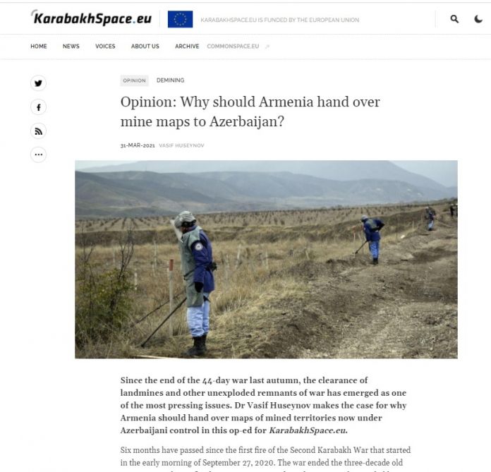 “Karabakhspace.eu” saytında Beynəlxalq Münasibətlərin Təhlili Mərkəzində baş məsləhətçisi Vasif Hüseynovun “Ermənistan minalanmış ərazilərin xəritələrini Azərbaycana niyə təhvil verməlidir” sərlövhəli məqaləsi dərc olunub.