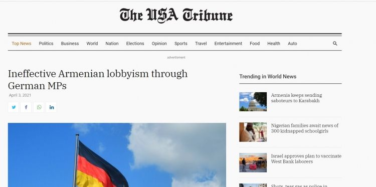 Amerikanın müstəqil nəşri “The USA Tribune” Robert Horovitzin Almaniyadakı erməni lobbi fəaliyyəti ilə bağlı məqaləsini dərc edib. “Alman deputatları vasitəsi ilə effektiv olmayan erməni lobbiçiliyi” başlıqlı məqalədə ermənipərəst lobbiçilər tərəfindən həm federal, həm də yerli səviyyədə alman parlamentarilərinə çoxsaylı rüşvət verilməsi faktlarından bəhs olunur.