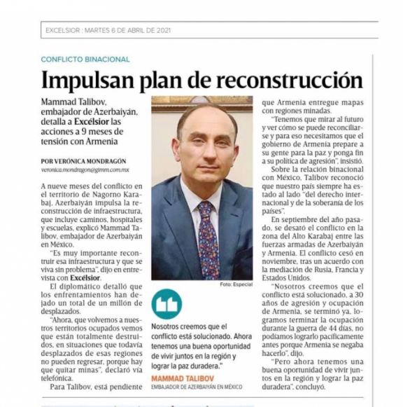 Azərbaycanın Meksikadakı səfiri Məmməd Talıbovla müsahibələr əsasında həmin ölkənin aparıcı mətbu orqanlarından olan “Reforma” və “Excelsior” qəzetlərində işğaldan azad olunmuş ərazilərdə Azərbaycanın apardığı minatəmizləmə və yenidənqurma işləri barədə yazılar dərc olunub.
