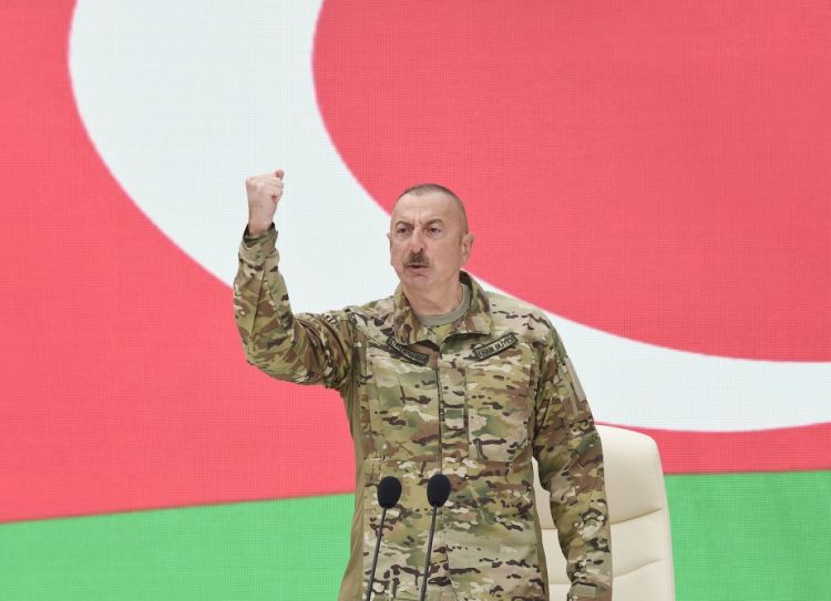 Aprel döyüşlərində Ermənistana şans verildiyini deyən Dövlət başçısı bildirib ki, 2018-ci ildə Naxçıvan əməliyyatı, yenə də onlara dərs verdik, yenə də göstərdik ki, axırı pis olacaq, məhv edəcəyik sizi. O da dərs olmadı. O da düşdü hakimiyyət dəyişikliyinə. Ermənistana təzə hakimiyyət gəlmişdi. Ondan bir ay sonra biz Naxçıvanda sərhəddə uğurlu əməliyyat keçirərək önəmli strateji yerləri götürmüşdük və artıq Qarabağa gedən yola tam nəzarət edirdik. Müharibə dövründə, - indi bu, sirr deyil, - bilirdik ki, Dağlıq Qarabağa nə aparılır. İstənilən an o yolu kəsə bilərdik. Sadəcə olaraq, buna ehtiyac yox idi. O da dərs olmadı. Ondan sonra yeni hakimiyyət bizdən vaxt istədi. Dedi ki, vaxt verin biz burada daxili problemləri, köhnə xunta nümayəndələrinin problemlərini həll edək, biz həll edəcəyik. Bizi yenə də aldatdılar. Ondan bir il sonra Ermənistanın baş naziri Dağlıq Qarabağda demişdi ki, “Qarabağ Ermənistandır”. Bu, nə deməkdir? O deməkdir ki, danışıqlar qurtardı, mənasızdır. Bu, danışıqların sonu idi. Təxribat xarakterli digər addımlar, hərəkətlər, çıxışlar göstərirdi ki, Ermənistan torpaqları qaytarmaq istəmir. Azad edilmiş torpaqlarda gördüyümüz mənzərə, sizin dəf etdiyiniz o təmas xətləri, o müdafiə xətləri göstərir ki, bir qarış torpaq vermək istəmirdilər. Başımızı aldatmaq, öz himayədarlarına arxalanmaq, onlardan müftə silah almaq, siyasi dəstək almaq, onların ölkələrində yaşayan lobbiçilərdən istifadə etmək və bizi bu vəziyyətdə əbədi saxlamaq - bu idi onların niyyəti. Ondan sonra iyul ayında dövlət sərhədində təxribatlar törədildi, avqust ayında diversiya qrupu göndərildi və sentyabr ayında artıq İkinci Qarabağ müharibəsi başlamışdır".