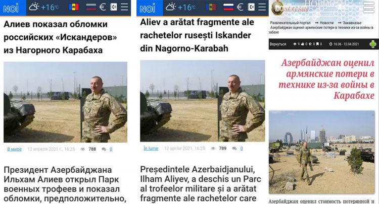 NUHÇIXAN İnformasiya Agentliyi xəbər verir ki, “Noi.md” saytında dərc olunan xəbərdə Hərbi Qənimətlər Parkında Vətən müharibəsinin gedişində Azərbaycan Ordusu tərəfindən düşməndən qənimət götürülən hərbi texnikanın bir qisminin - 300-dən çox eksponatın, o cümlədən 150-dən çox ağır texnikanın, tankların, döyüş maşınlarının, artilleriya qurğularının, zenit-raket komplekslərinin, atıcı silahların və hərbi nəqliyyat vasitələrinin sərgiləndiyi bildirilir. Eyni zamanda, Şuşaya atılan Rusiya istehsallı “İsgəndər–M” raketlərinin Ermənistanın haradan əldə etdiyi barədə Prezident İlham Əliyevin sualı və ölkəmizin bu suala cavab gözlədiyi qeyd olunur.