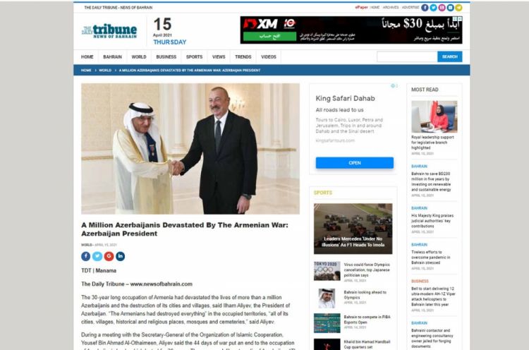 Bəhreynin “The Daily Tribune–News of Bahrain” qəzetində Azərbaycan Prezidenti İlham Əliyevin İslam Əməkdaşlıq Təşkilatının Baş katibi Yusif bin Əhməd Əl-Osayminlə görüşü haqqında məqalə dərc olunub.