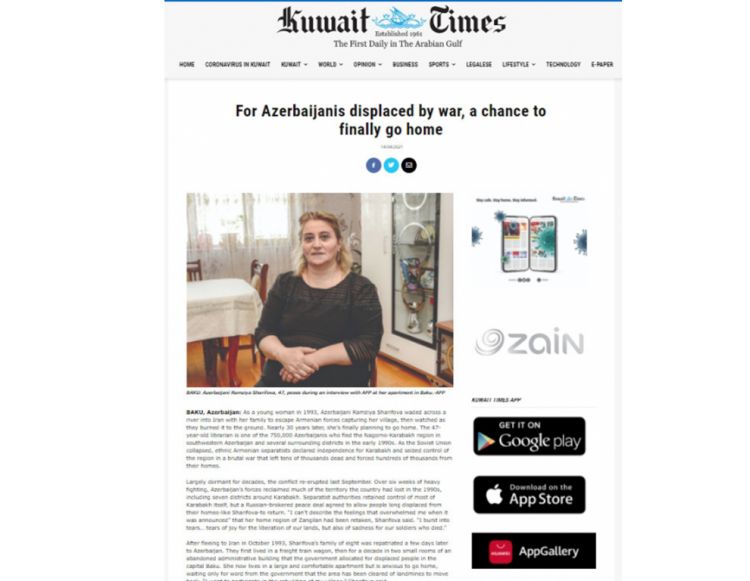 Küveytin gündəlik “Kuwait Times” qəzetində dünyanın aparıcı media qurumlarından olan “France-Press” (AFP) agentliyinə istinadla Ermənistanın hərbi təcavüzü nəticəsində 1990-cı illərin əvvəllərində Dağlıq Qarabağ və ətraf rayonlardan məcburi köçkün düşmüş insanların keçdikləri çətin həyat yolundan, onların bu illər ərzində doğma torpaqlarına qayıtmaq həsrətləri ilə yaşamalarından, nəhayət, işğal altındakı torpaqların azad edilməsindən sonra öz evlərinə qayıtmaq şansının yaranmasından bəhs edən məqalə dərc olunub.