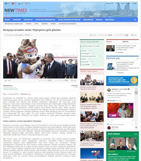 Rusiyanın xarici işlər naziri Sergey Lavrovun Ermənistanın yeni hakimiyyəti ilə bağlı jurnalistə dediyi sözlər erməni siyasi və ekspert dairələrində geniş əks-səda doğurub. Onlar qəfil ayılıb görürlər ki, tam olaraq Moskvadan asılıdırlar və Rusiya rəhbərliyi bu barədə açıq fikir bildirə bilər. Dəfələrlə bu, belə olub. Məsələn, müxtəlif səviyyələrdə ermənilərə anladıblar ki, Dağlıq Qarabağı özbaşına işğal etməyiblər. Onlara ciddi hərbi, maliyyə, ideoloji, təbliğat və diplomatik dəstək olub. Onların sırasında Rusiya da vardır.