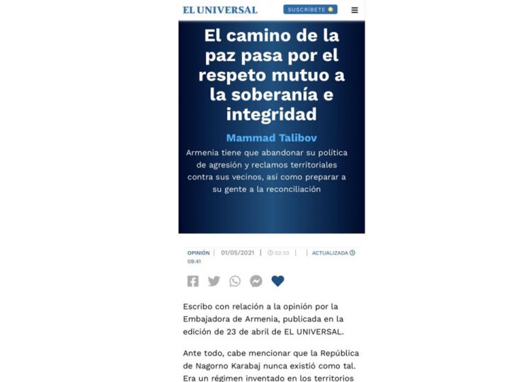 Meksikanın ən nüfuzlu mətbu orqanlarından olan “El Universal” qəzetində Azərbaycanın həmin ölkədəki səfiri Məmməd Talıbovun “Sülhə gedən yol dövlətlərin suverenliyi və ərazi bütövlüyünə qarşılıqlı hörmətdən keçir” başlıqlı məqaləsi dərc edilib.