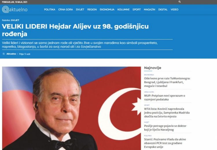 Monteneqronun bir sıra nəşrlərində Skalaradio (https://skalaradio.com/veliki-lider-hajdar-alijev-uz-98-godisnjicu-rodenja/), BHDinfodesk (https://bhdinfodesk.com/2021/05/10/veliki-lideri-hejdar-alijev-uz-98-godisnjicu-rodenja/), Aktuelno.me (https://www.aktuelno.me/svijet/veliki-lideri-hejdar-alijev-uz-98-godisnjicu-rodjenja/) Azərbaycan xalqının ümummilli lideri Heydər Əliyevin anadan olmasının 98-ci ildönümünə həsr olunmuş məqalələr dəc edilib.