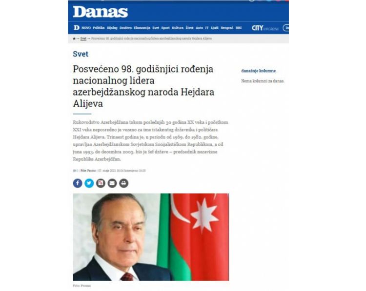 Azərbaycan xalqının ümummilli lideri Heydər Əliyevin anadan olmasının 98-ci ildönümü günündə Serbiyanın “Danas” nəşrində bu dahi siyasi xadimin həyat yolundan bəhs edən məqalə dərc olunub (https://www.danas.rs/svet/posveceno-98-godisnjici-rodjenja-nacionalnog-lidera-azerbejdzanskog-naroda-hejdara-alijeva/).