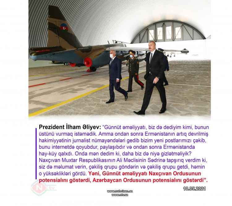 “Günnüt əməliyyatı, biz də dediyim kimi, bunun üstünü vurmaq istəmədik. Amma ondan sonra Ermənistanın artıq devrilmiş hakimiyyətinin jurnalist nümayəndələri gedib bizim yeni postlarımızı çəkib, bunu internetdə qoyubdur, paylaşıbdır və ondan sonra Ermənistanda hay-küy qalxdı. Onda mən dedim ki, daha biz də niyə gizlətməliyik? Naxçıvan Muxtar Respublikasının Ali Məclisinin Sədrinə tapşırıq verdim ki, siz də məlumat verin, çəkiliş qrupu göndərin və çəkiliş qrupu getdi, həmin o yüksəklikləri gördü. Yəni, Günnüt əməliyyatı Naxçıvan Ordusunun potensialını göstərdi, Azərbaycan Ordusunun potensialını göstərdi”. NUHÇIXAN İnformasiya Agentliyi xəbər verir ki, bu sözləri Prezident İlham Əliyev mayın 10-da Naxçıvana səfəri zamanı Azərbaycan Televiziyasına müsahibə verərkən deyib.