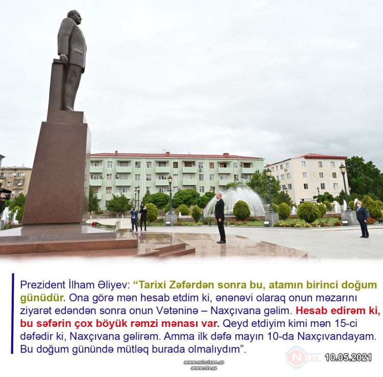 “Tarixi Zəfərdən sonra bu, atamın birinci doğum günüdür. Ona görə mən hesab etdim ki, ənənəvi olaraq onun məzarını ziyarət edəndən sonra onun Vətəninə – Naxçıvana gəlim. Hesab edirəm ki, bu səfərin çox böyük rəmzi mənası var. Qeyd etdiyim kimi mən 15-ci dəfədir ki, Naxçıvana gəlirəm. Amma ilk dəfə mayın 10-da Naxçıvandayam. Bu doğum günündə mütləq burada olmalıydım”. NUHÇIXAN İnformasiya Agentliyinin məlumatına görə, bunu Prezident İlham Əliyev mayın 10-da Naxçıvan Muxtar Respublikasına səfəri çərçivəsində Azərbaycan Televiziyasına müsahibəsində deyib.