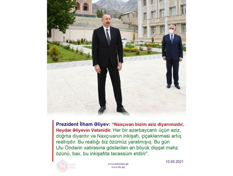 “Naxçıvan bizim əziz diyarımızdır, Heydər Əliyevin Vətənidir. Hər bir azərbaycanlı üçün əziz, doğma diyardır və Naxçıvanın inkişafı, çiçəklənməsi artıq reallıqdır. Bu reallığı biz özümüz yaratmışıq. Bu gün Ulu Öndərin xatirəsinə göstərilən ən böyük diqqət məhz özünü, bax, bu inkişafda təcəssüm etdirir”.