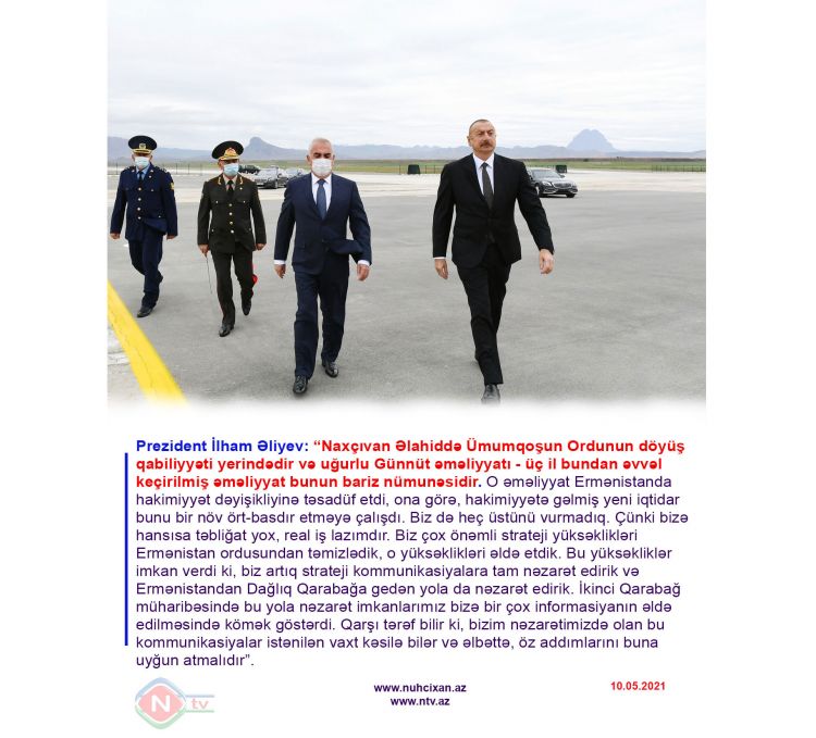 “Naxçıvan Əlahiddə Ümumqoşun Ordunun döyüş qabiliyyəti yerindədir və uğurlu Günnüt əməliyyatı - üç il bundan əvvəl keçirilmiş əməliyyat bunun bariz nümunəsidir. O əməliyyat Ermənistanda hakimiyyət dəyişikliyinə təsadüf etdi, ona görə, hakimiyyətə gəlmiş yeni iqtidar bunu bir növ ört-basdır etməyə çalışdı. Biz də heç üstünü vurmadıq. Çünki bizə hansısa təbliğat yox, real iş lazımdır. Biz çox önəmli strateji yüksəklikləri Ermənistan ordusundan təmizlədik, o yüksəklikləri əldə etdik. Bu yüksəkliklər imkan verdi ki, biz artıq strateji kommunikasiyalara tam nəzarət edirik və Ermənistandan Dağlıq Qarabağa gedən yola da nəzarət edirik. İkinci Qarabağ müharibəsində bu yola nəzarət imkanlarımız bizə bir çox informasiyanın əldə edilməsində kömək göstərdi. Qarşı tərəf bilir ki, bizim nəzarətimizdə olan bu kommunikasiyalar istənilən vaxt kəsilə bilər və əlbəttə, öz addımlarını buna uyğun atmalıdır”.