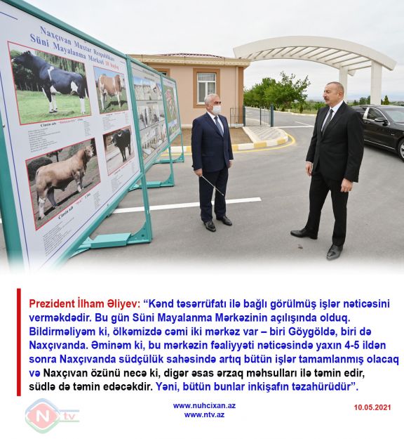 “Kənd təsərrüfatı ilə bağlı görülmüş işlər nəticəsini verməkdədir. Bu gün Süni Mayalanma Mərkəzinin açılışında olduq. Bildirməliyəm ki, ölkəmizdə cəmi iki mərkəz var – biri Göygöldə, biri də Naxçıvanda. Əminəm ki, bu mərkəzin fəaliyyəti nəticəsində yaxın 4-5 ildən sonra Naxçıvanda südçülük sahəsində artıq bütün işlər tamamlanmış olacaq və Naxçıvan özünü necə ki, digər əsas ərzaq məhsulları ilə təmin edir, südlə də təmin edəcəkdir. Yəni, bütün bunlar inkişafın təzahürüdür”.