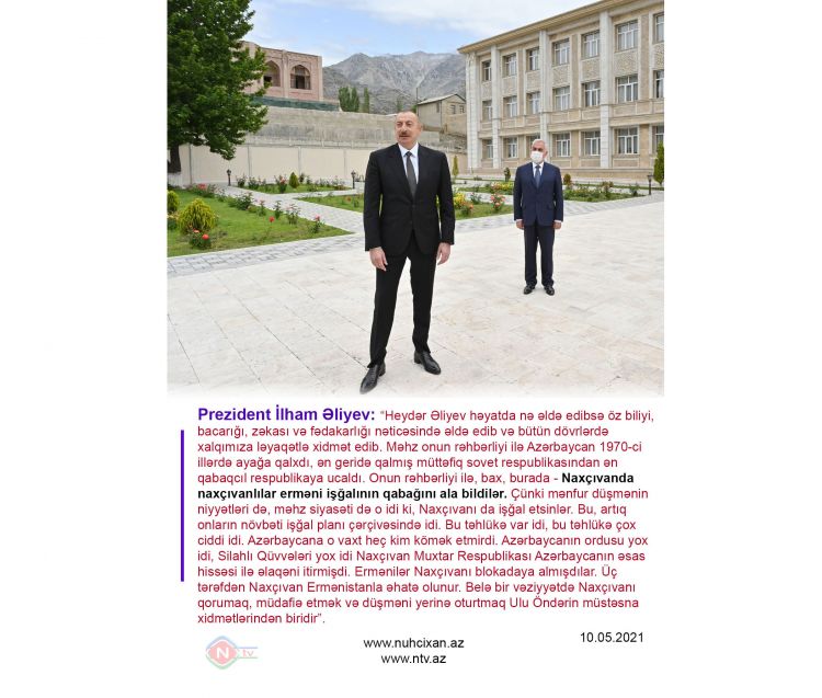 “Heydər Əliyev həyatda nə əldə edibsə öz biliyi, bacarığı, zəkası və fədakarlığı nəticəsində əldə edib və bütün dövrlərdə xalqımıza ləyaqətlə xidmət edib. Məhz onun rəhbərliyi ilə Azərbaycan 1970-ci illərdə ayağa qalxdı, ən geridə qalmış müttəfiq sovet respublikasından ən qabaqcıl respublikaya ucaldı. Onun rəhbərliyi ilə, bax, burada - Naxçıvanda naxçıvanlılar erməni işğalının qabağını ala bildilər. Çünki mənfur düşmənin niyyətləri də, məhz siyasəti də o idi ki, Naxçıvanı da işğal etsinlər. Bu, artıq onların növbəti işğal planı çərçivəsində idi. Bu təhlükə var idi, bu təhlükə çox ciddi idi. Azərbaycana o vaxt heç kim kömək etmirdi. Azərbaycanın ordusu yox idi, Silahlı Qüvvələri yox idi. Naxçıvan Muxtar Respublikası Azərbaycanın əsas hissəsi ilə əlaqəni itirmişdi. Ermənilər Naxçıvanı blokadaya almışdılar. Üç tərəfdən Naxçıvan Ermənistanla əhatə olunur. Belə bir vəziyyətdə Naxçıvanı qorumaq, müdafiə etmək və düşməni yerinə oturtmaq Ulu Öndərin müstəsna xidmətlərindən biridir”.