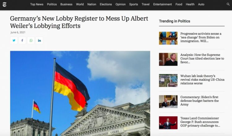 Amerikada çıxan “The USA Tribune” qəzetində siyasi şərhçi Robert Qorovitsin “Almaniyada yeni lobbizm reyestri Albert Veylerin lobbiçilik səylərini pozacaq” sərlövhəli məqaləsi dərc olunub. Materialda Ermənistanın milli maraqlarına xidmət edən Almaniyadan olan pulla ələ alınmış qanunvericilərdən və alman hakimiyyət orqanlarının ölkənin siyasi sistemində korrupsiyaya nəzarət sisteminin zəif olmasından söhbət açılır.