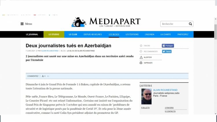 Fransanın “Mediapart” portalında “Azərbaycanda iki jurnalist minaya düşərək həlak olub” adlı məqalə dərc olunub.