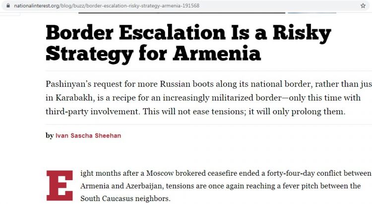 Daha sonra yazıda deyilir: "Ermənistan Azərbaycanın beynəlxalq səviyyədə bir parçası olaraq tanınan, amma 30 ilə yaxındır işğal etdikləri Qarabağdakı məğlubiyyətilə hələ də barışmır. Hazırda Baş nazir Nikol Paşinyan çətin vəziyyətdədir. Belə ki, onun Ermənistanda millətçilər üçün başlıca problem olan Qarabağa arxa çevirməsi satqınlıq kimi qəbul ediləcək, müharibəyə əl atması isə dağıdıcı nəticə verəcək. Bunun əvəzində Paşinyan və Ermənistandakı qüvvələr orta məxrəcə gələrək müharibəni başqa vasitələrlə davam edirlər. Sərhəddə kiçik səviyyəli atışmalar gərginliyi qüvvədə saxlayır, erməni xalqının düşmənə qarşı çıxması qəzəbi daha çox xaricə yönəldilir. Paşinyan bilir ki, qışda COVID-19 və münaqişə səbəbindən iqtisadi çətinlikləri daha da üzə çıxacaq. Beləcə, baş qatmaq taktikası Baş nazir üçün həyati məsələyə çevrilir".