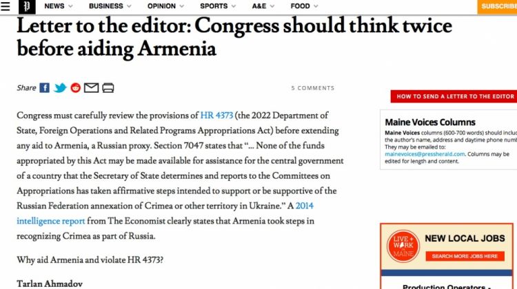 ABŞ-ın “Portland Press Herald” qəzetində Azərbaycan icmasının üzvü Tərlan Əhmədovun separatizmi dəstəkləyən Ermənistana yardımın ayrılması ilə bağlı yanlış qərardan bəhs edən “Konqres Ermənistana kömək etməzdən əvvəl yaxşı düşünməlidir” sərlövhəli məqaləsi dərc olunub.