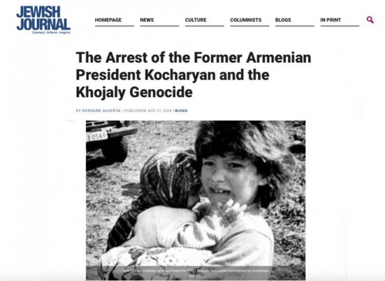 ABŞ-da çıxan “Jewish Journal” nəşrində Xocalı qırğınının şahidi, bu dəhşətli qətliamdan möcüzəli şəkildə salamat qalmış Dürdanə Ağayevanın “Ermənistanın sabiq prezidenti Koçaryanın həbsi və Xocalı soyqırımı” adlı məqaləsi dərc olunub.