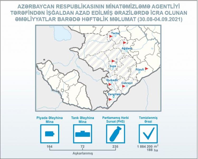 ANAMA-dan NUHÇIXAN İnformasiya Agentliyinə verilən məlumata görə, avqustun 30-dan sentyabrın 4-dək Tərtər, Ağdam, Füzuli, Şuşa, Qubadlı, Cəbrayıl və Zəngilan rayonlarının ərazilərində aparılmış əməliyyat-axtarış tədbirləri zamanı piyada əleyhinə 164, tank əleyhinə 72 mina və 235 ədəd partlamamış hərbi sursat aşkarlanıb.