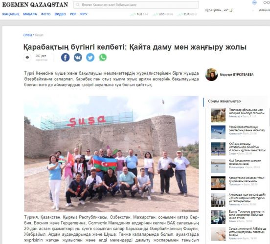 Qazaxıstanın rəsmi dövlət qəzeti “Egemen Qazaqstan”da Türk Şurasına üzv və iştirakçı dövlətlərin nümayəndələrinin və jurnalistlərinin Azərbaycanın işğaldan azad olunmuş torpaqlara səfəri barədə “Qarabağın mövcud vəziyyəti: yenidənqurma və inkişaf yolu” adlı geniş məqalə dərc edilib.