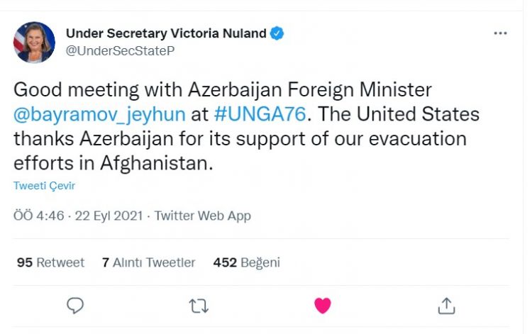 Sentyabrın 21-də BMT Baş Assambleyasının 76-cı sessiyası çərçivəsində ABŞ dövlət katibinin müavini Viktoriya Nuland və Azərbaycanın xarici işlər naziri Ceyhun Bayramov arasında görüş keçirilib.