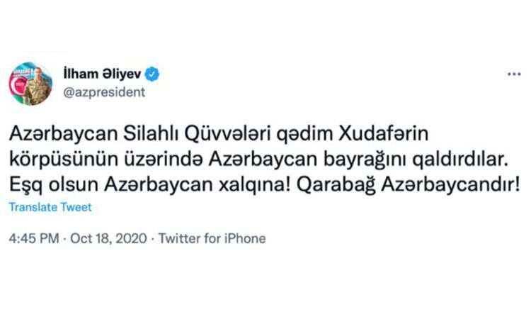 • Azərbaycan Silahlı Qüvvələri qədim Xudafərin körpüsünün üzərində Azərbaycan bayrağını qaldırdılar. Prezident İlham Əliyev bunu özünün rəsmi tviter səhifəsində bildirib.
