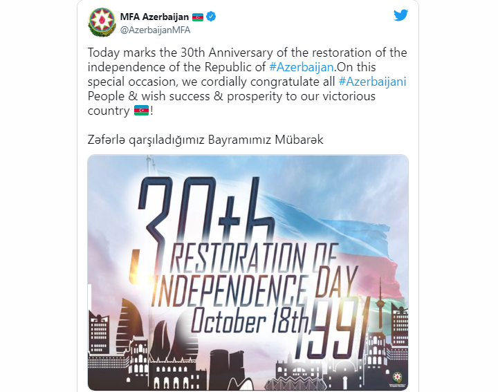 "Tarixi Zəfərimizin ilk ilində Azərbaycanın müstəqilliyinin bərpasının 30 yaşını ləyaqətlə qeyd edirik".