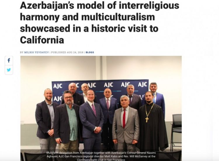 Azərbaycan nümayəndə heyətinin üzvləri Kaliforniyada olarkən bir sıra dini liderləri və Kaliforniyanın qanunvericiləri, habelə yerli yəhudi icmasının rəhbərləri ilə görüşüblər. Bu görüşlərdə Azərbaycanda ta qədimdən mövcud olan tolerantlıq və multikulturalizm ənənələri müzakirə edilib. Azərbaycanda müxtəlif etnik və dini qrupları təmsil edən insanların, o cümlədən müsəlmanlar, pravoslav xristianlar, katoliklər, protestantlar, yəhudilər və digər konfessiyaların nümayəndələri əsrlərboyu qardaşcasına dostluq və qarşılıqlı hörmət şəraitində yaşayırlar.