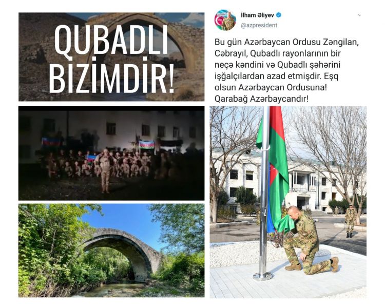 “25 oktyabr 2020-ci il tarixində Müzəffər Ali Baş Komandan cənab İlham Əliyevin rəhbərliyi altında Rəşadətli Azərbaycan Ordusu Qubadlı şəhərində üçrəngli bayrağımızı ucaltdı”.