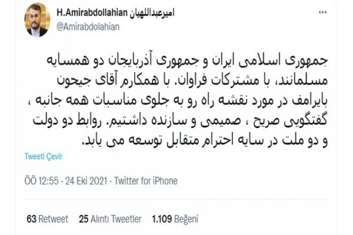 NUHÇIXAN İnformasiya Agentliyi xəbər verir ki, bu sözləri İranın xarici işlər naziri Hüseyn Əmir Abdullahian özünün tviter hesabında yazıb.