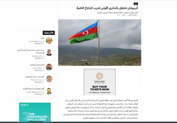 Əlcəzairin “Əl Şuruğ” portalında Azərbaycan və Türkiyə prezidentləri İlham Əliyev və Rəcəb Tayyib Ərdoğanın Füzuli aeroportunun açılışında iştirakı, iki qardaş ölkənin işğaldan azad edilmiş ərazilərdə çiyin-çiyinə bərpa-quruculuq işləri aparması barədə məqalə yayımlanıb.