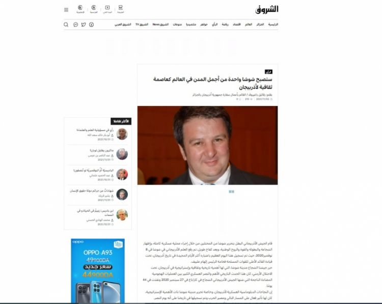 Əlcəzairin “Əl Şuruğ” qəzetində Azərbaycanın bu ölkədəki müvəqqəti işlər vəkili Rəfail Bağırovun “Azərbaycanın mədəniyyət paytaxtı Şuşa dünyanın ən gözəl şəhərinə çevriləcək” sərlövhəli məqaləsi dərc olunub.