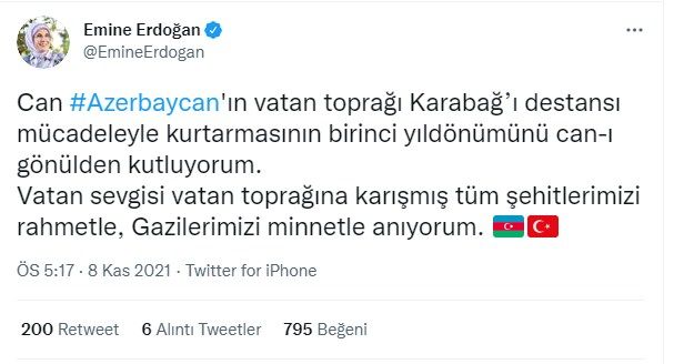 Türkiyə Prezidenti Rəcəb Tayyib Ərdoğanın həyat yoldaşı Əminə Ərdoğan 8 Noyabr - Zəfər Günü münasibətilə Azərbaycan xalqını təbrik edib.