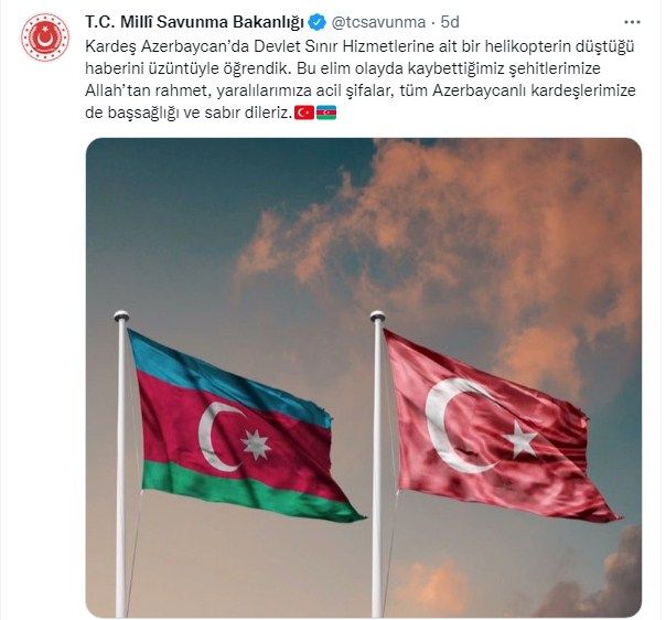 Türkiyə Müdafiə Nazirliyi helikopter qəzası ilə bağlı Azərbaycana başsağlığı verib.