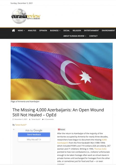 “Eurasiareview.com” portalında Londonda yerləşən “Henri Cekson Cəmiyyəti“ beyin mərkəzinin elmi tədqiqatçısı Taras Kuzionun “İtkin düşən 4000 azərbaycanlı: açıq yara hələ də sağalmayıb” sərlövhəli məqaləsi dərc edilib.