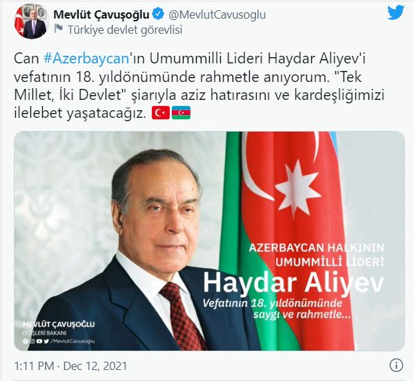 Türkiyənin xarici işlər naziri Mövlud Çavuşoğlu Ümummilli Lider Heydər Əliyevin vəfatının 18-ci ildönümü ilə bağlı tviter səhifəsində paylaşım edib.