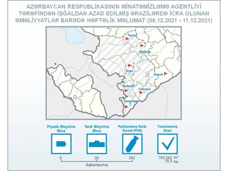 ANAMA-dan NUHÇIXAN İnformasiya Agentliyinə verilən məlumata görə, dekabrın 6-dan 11-dək Tərtər, Ağdam, Füzuli, Şuşa, Qubadlı, Cəbrayıl və Zəngilanda aparılan əməliyyat-axtarış tədbirləri zamanı piyada əleyhinə 9, tank əleyhinə 29 mina və 262 partlamamış hərbi sursat aşkarlanaraq zərərsizləşdirilib.