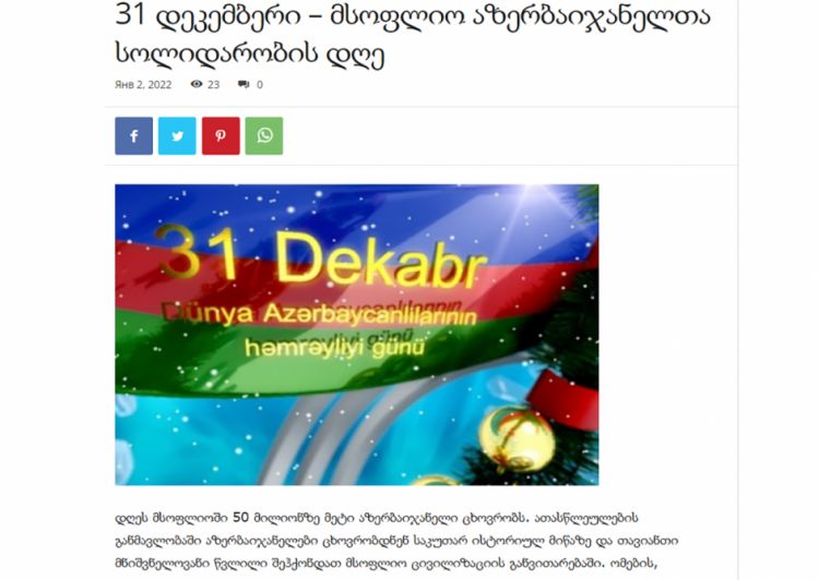 Gürcüstanda geniş oxucu kütləsinə malik “Adjara.ps” qəzetində “31 dekabr - Dünya Azərbaycanlılarının Həmrəyliyi Günü” adlı məqalə dərc olunub.