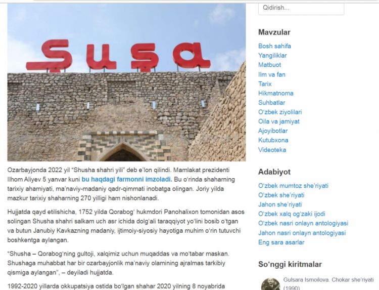Özbəkistanın “ziyouz.uz” portalı öz səhifəsində 2022-ci ilin ölkəmizdə “Şuşa İli” elan olunması ilə bağlı özbək dilində məqalə yerləşdirib.