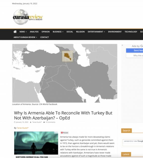 Eurasiareview.com portalında Londonda yerləşən “Henri Cekson Cəmiyyəti“ beyin mərkəzinin elmi tədqiqatçısı Taras Kuzionun Ermənistanın Türkiyə və Azərbaycan ilə münasibətlərindən bəhs edən məqaləsi dərc edilib.