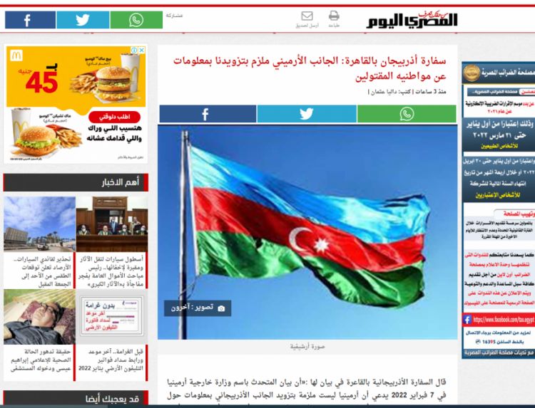 Misirin “Əl Masr Əl Yom” qəzetində “Azərbaycan müharibədə itkin düşmüş vətəndaşlarının taleyi barədə Ermənistandan məlumat tələb edir” sərlövhəli məqalə dərc olunub.
